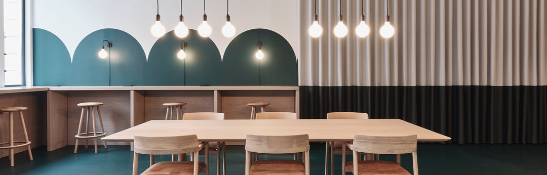 Tala’s Porcelain III bulbs and Graphite pendants create an eye-catching focal point, while providing functional light for the day-to-day requirements of the workplace.