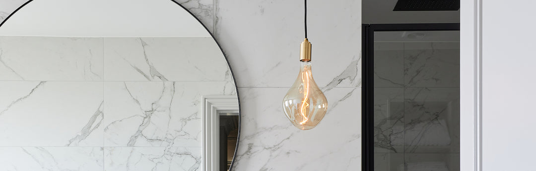 The Ridgeway residence features the Graphite Nine Pendant with Voronoi II displayed in the main staircase and the Single Brass Pendant with Voronoi II in the master bathroom, showcasing the versatility of the Voronoi II bulbs.