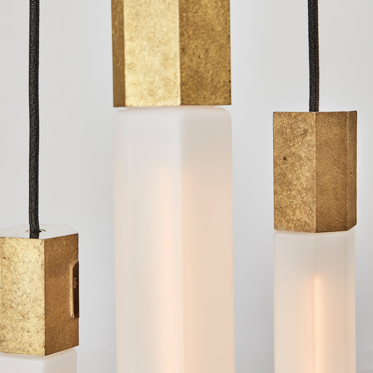 Paired with matte translucent borosilicate glass bulbs, complete with dimmable LED technology, the distinctive, irregular hexagonal pattern merges with the form of the pendants to create a stunning visual continuity.