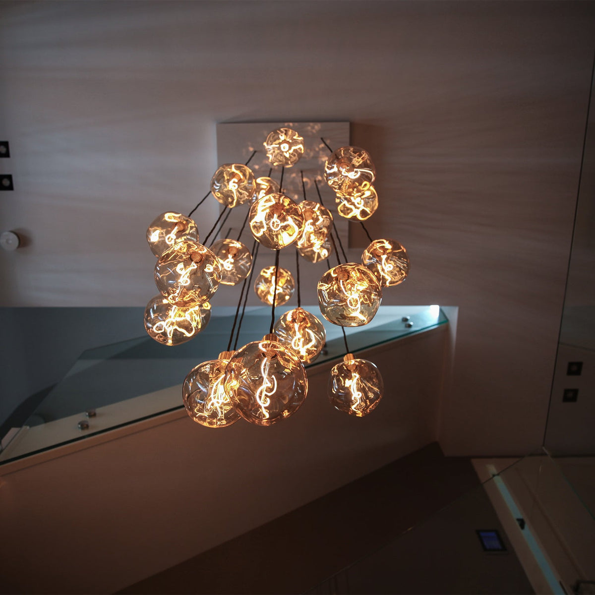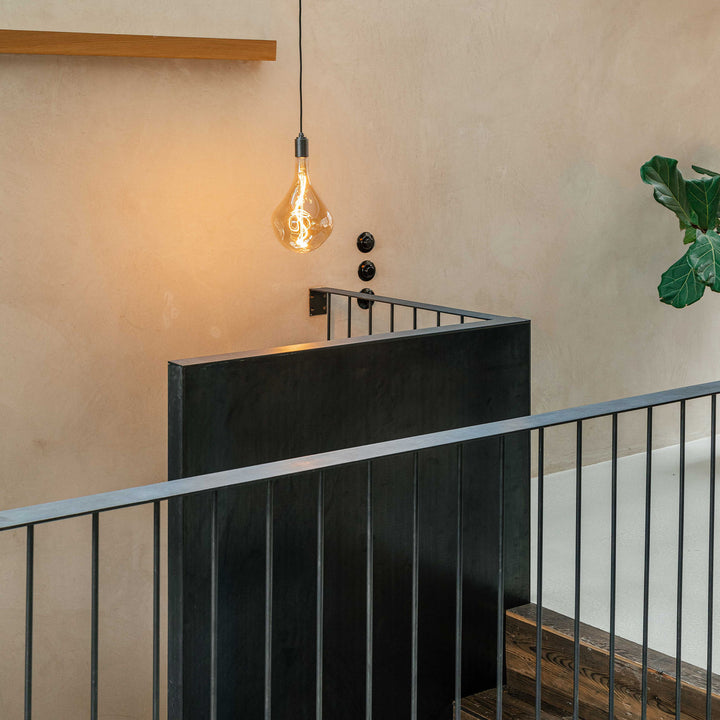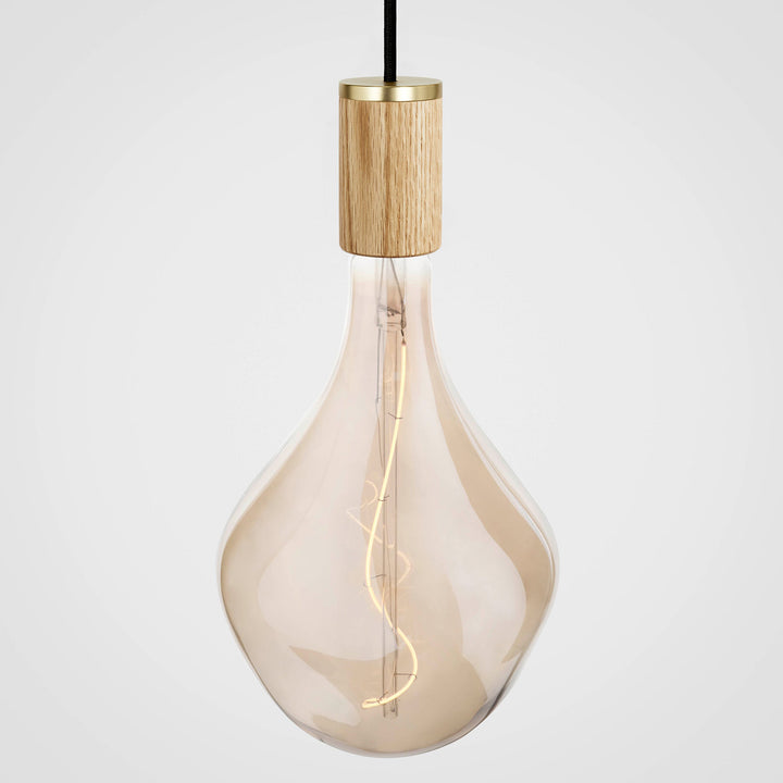 Mouth-blown and shaped in a solid steel mould. The custom LED filament is hand assembled around the glass core. The borosilicate glass has an iron tint finish to help create a soft and layered refraction of light.