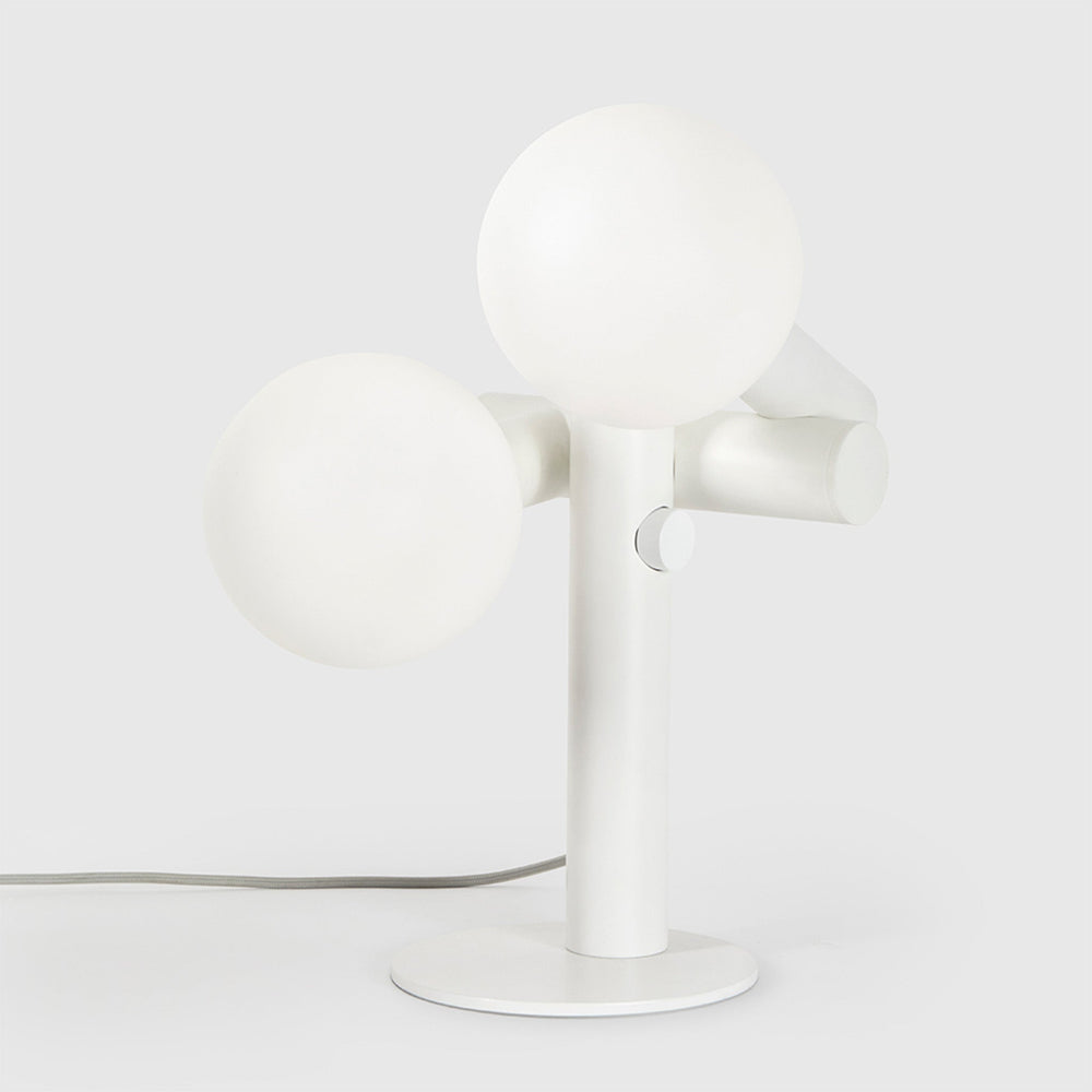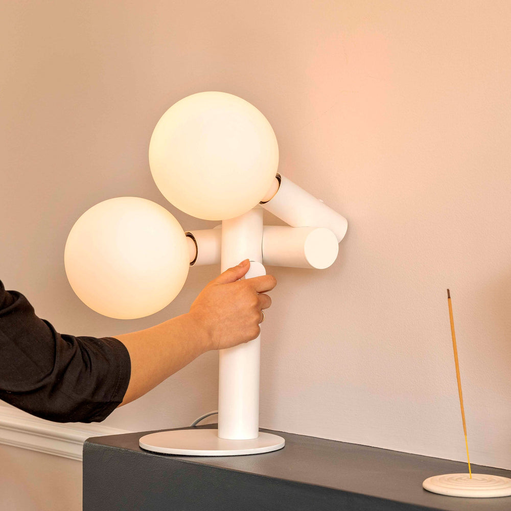 Comprised of three intersecting steel cylinders with a custom rotary dimmer on the stem and finished in a muted white powder-coated sheen, the Echo Table Lamp comes complete with two Sphere IV bulbs, offering unrivalled Dim to Warm performance.