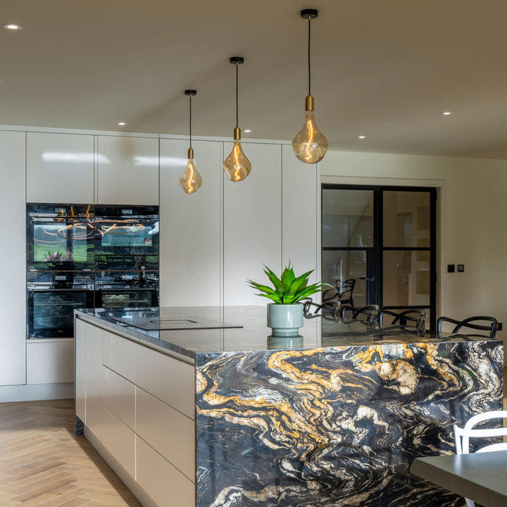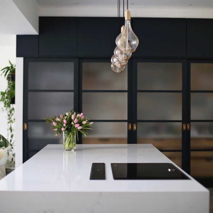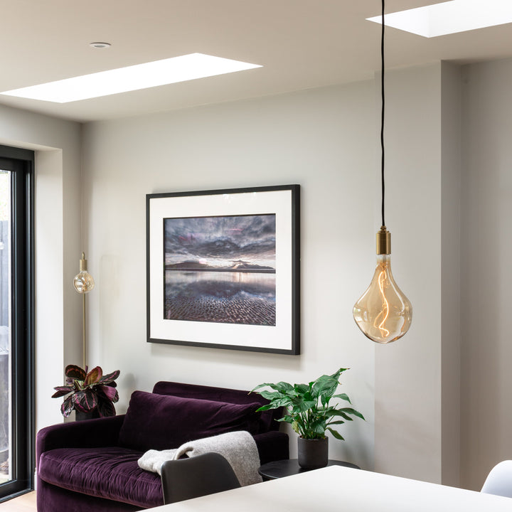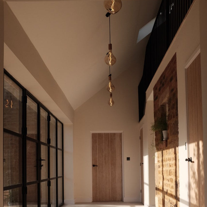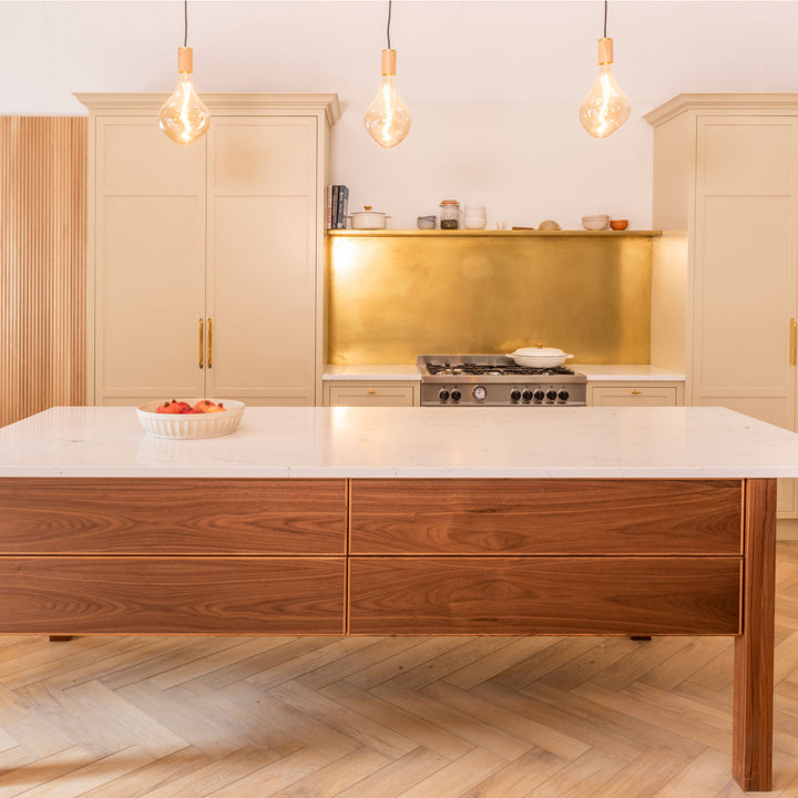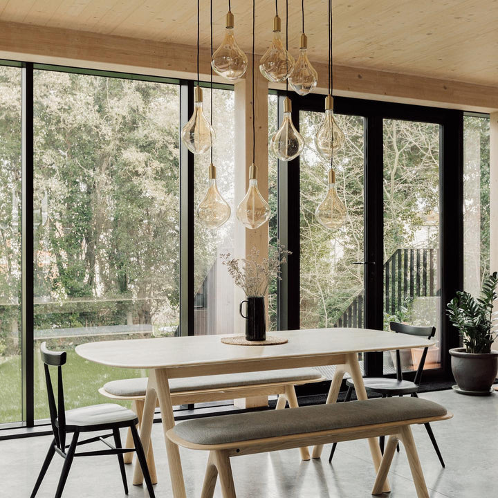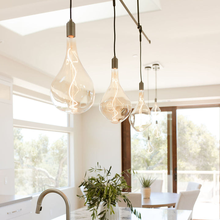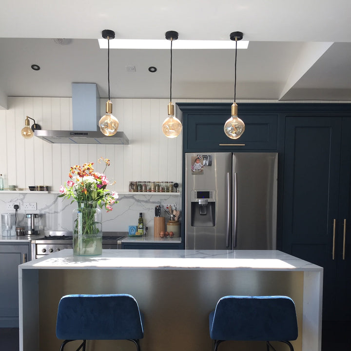 The Brass Linear Triple Pendant with Voronoi II is a new way to display our most popular bulb and pendant combination. Complete with three signature Brass pendants, the sleek and sturdy linear canopy is designed to display a trio of decorative bulbs in a uniform row. The white powder-coated steel frame merges seamlessly with your ceiling, while offering a hardy, secure base from which to hang your lights. Ideal for illuminating a kitchen island, dining table or hallway.