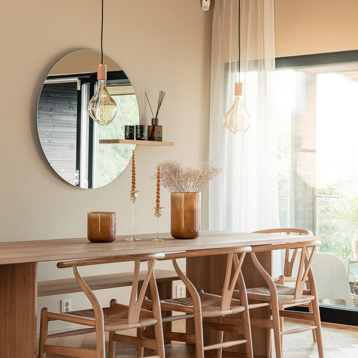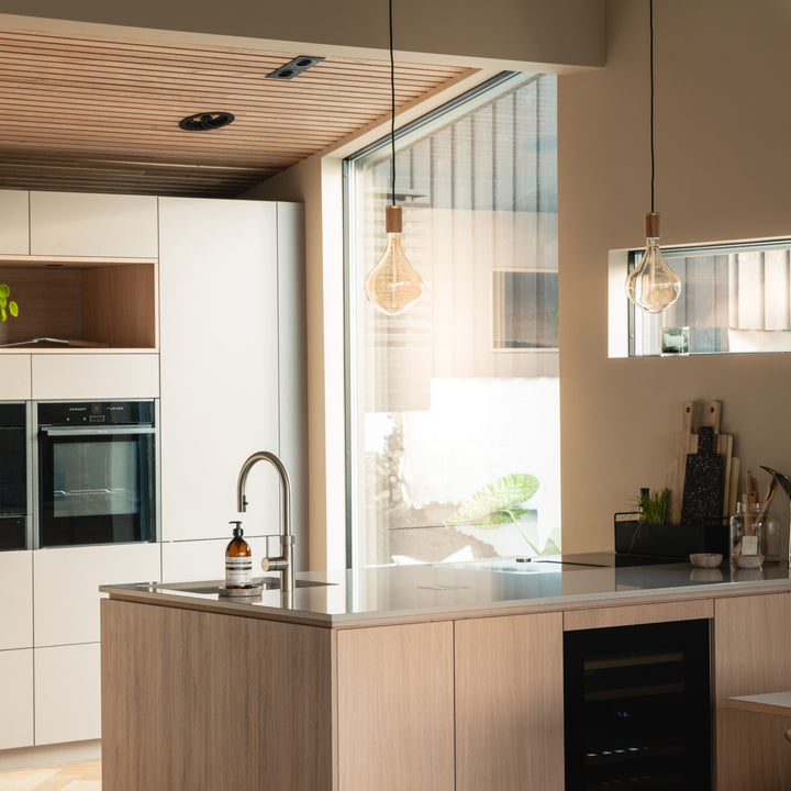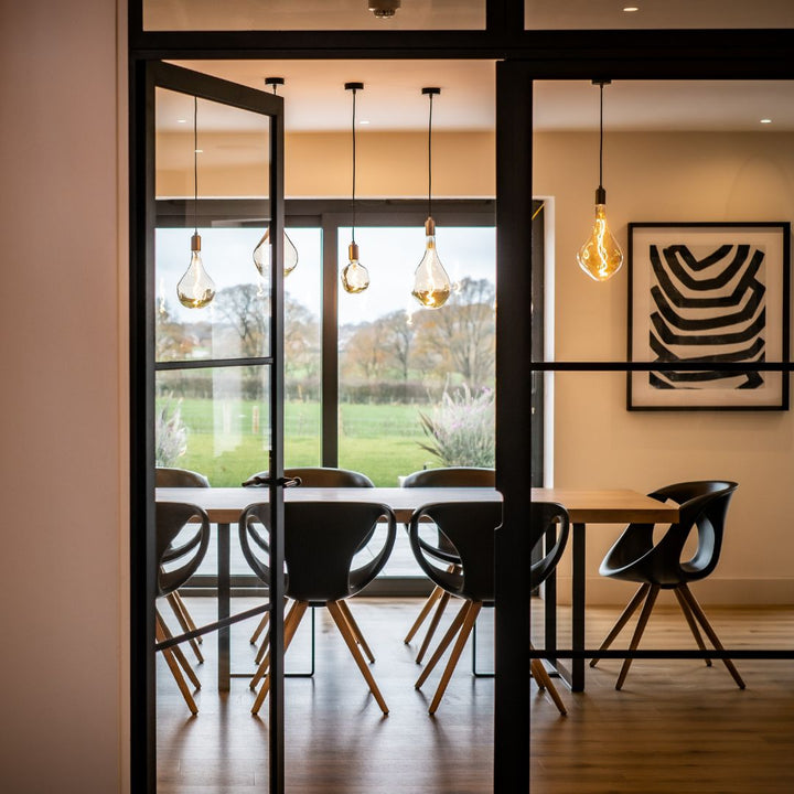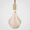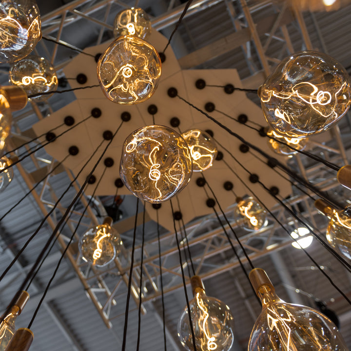 Voronoi bulbs are mouth-blown and shaped in a solid steel mould. The custom LED filament is hand assembled around the glass core, and the iron tint finish on the borosilicate glass helps create a soft and layered refraction of light.