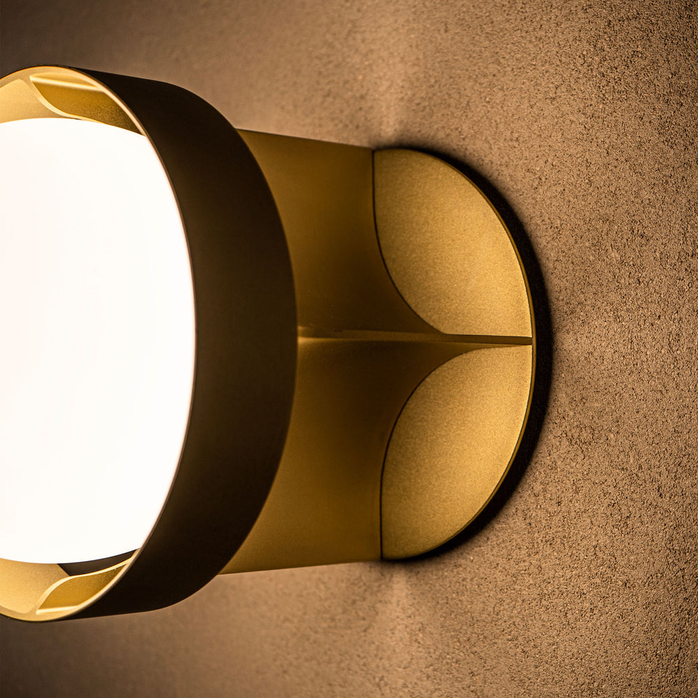 Defined by its economic and refined aesthetic, the Loop Wall Light is available in Gold and Dark Grey anodised finishes, and is paired here with the matte white Sphere IV bulb. IP44 wet-rated for outdoor use.