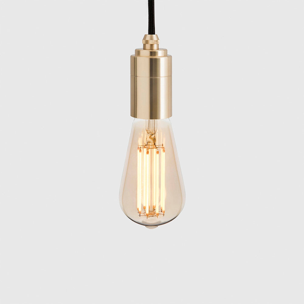 The industrial-style Squirrel Cage bulb, with its iron-tint glass finish and exposed filament design, emits a warm, amber hue. Paired with the Brass, Graphite, Oak or Walnut pendant, this is a ready-made lighting fixture all in one.